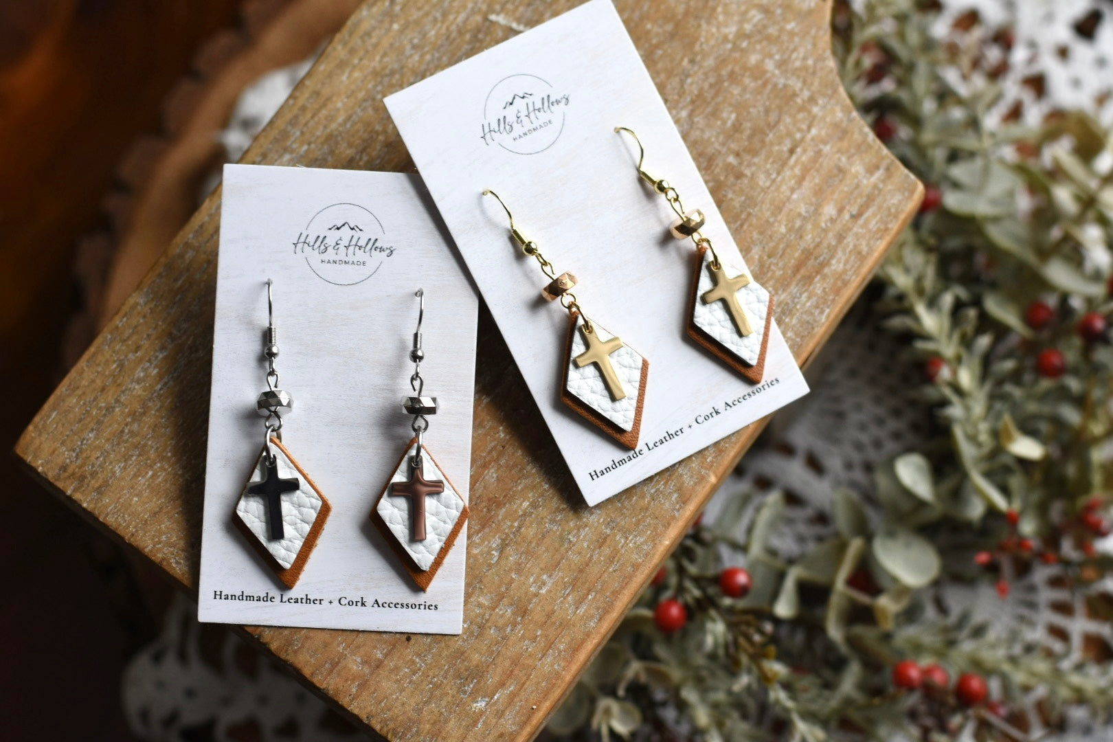 Hills & Hollows Handmade creates beautiful, one-of-a-kind leather + cork goods & accessories inspired by quality remnant leather. Each piece is hand cut using metal die cuts & hammer. Along with remnant and patterned leather, you will find an assortment of materials combined to create these unique pieces, including: denim, tassels, pendants, charms, genuine gemstones, and more!