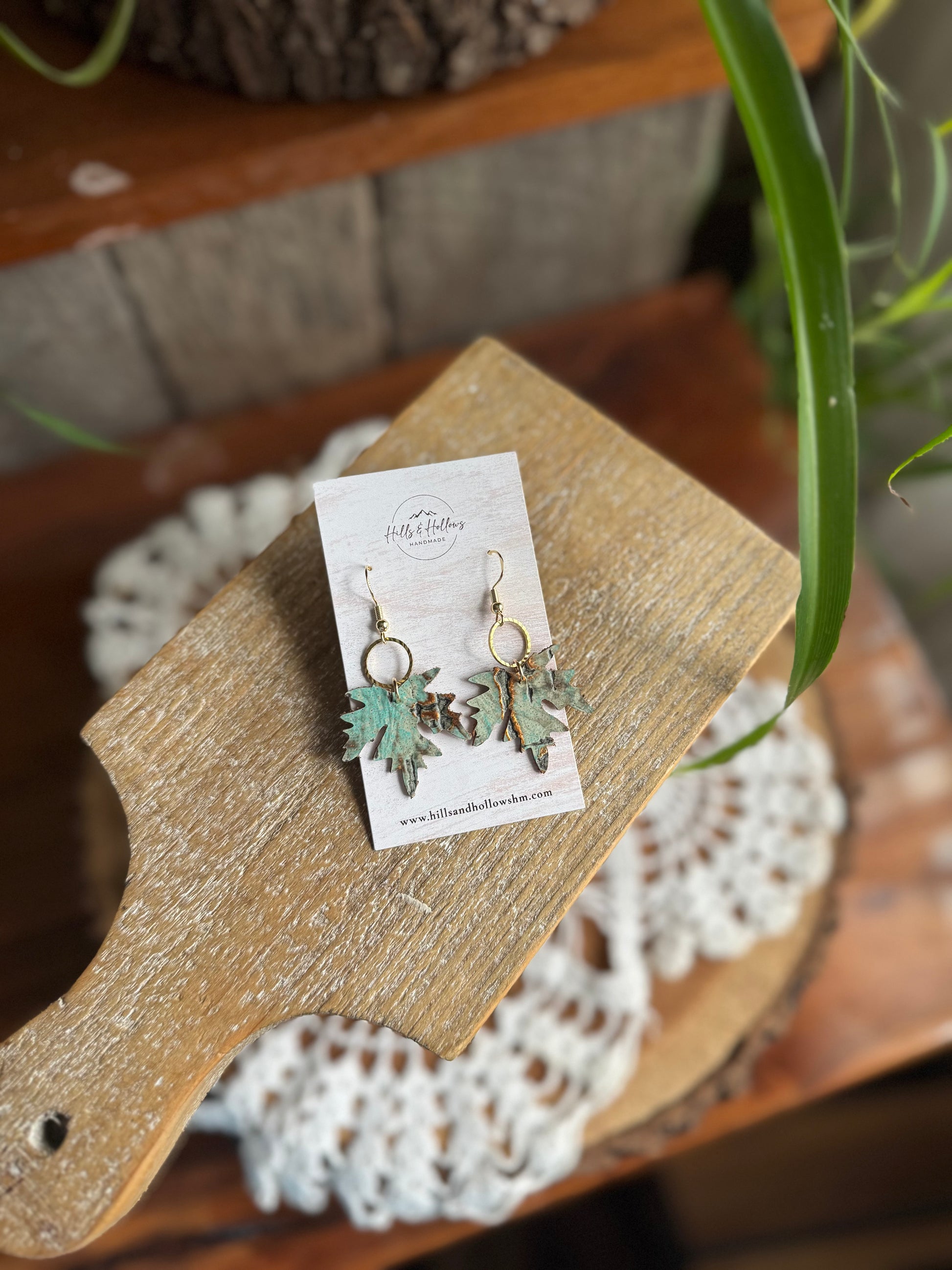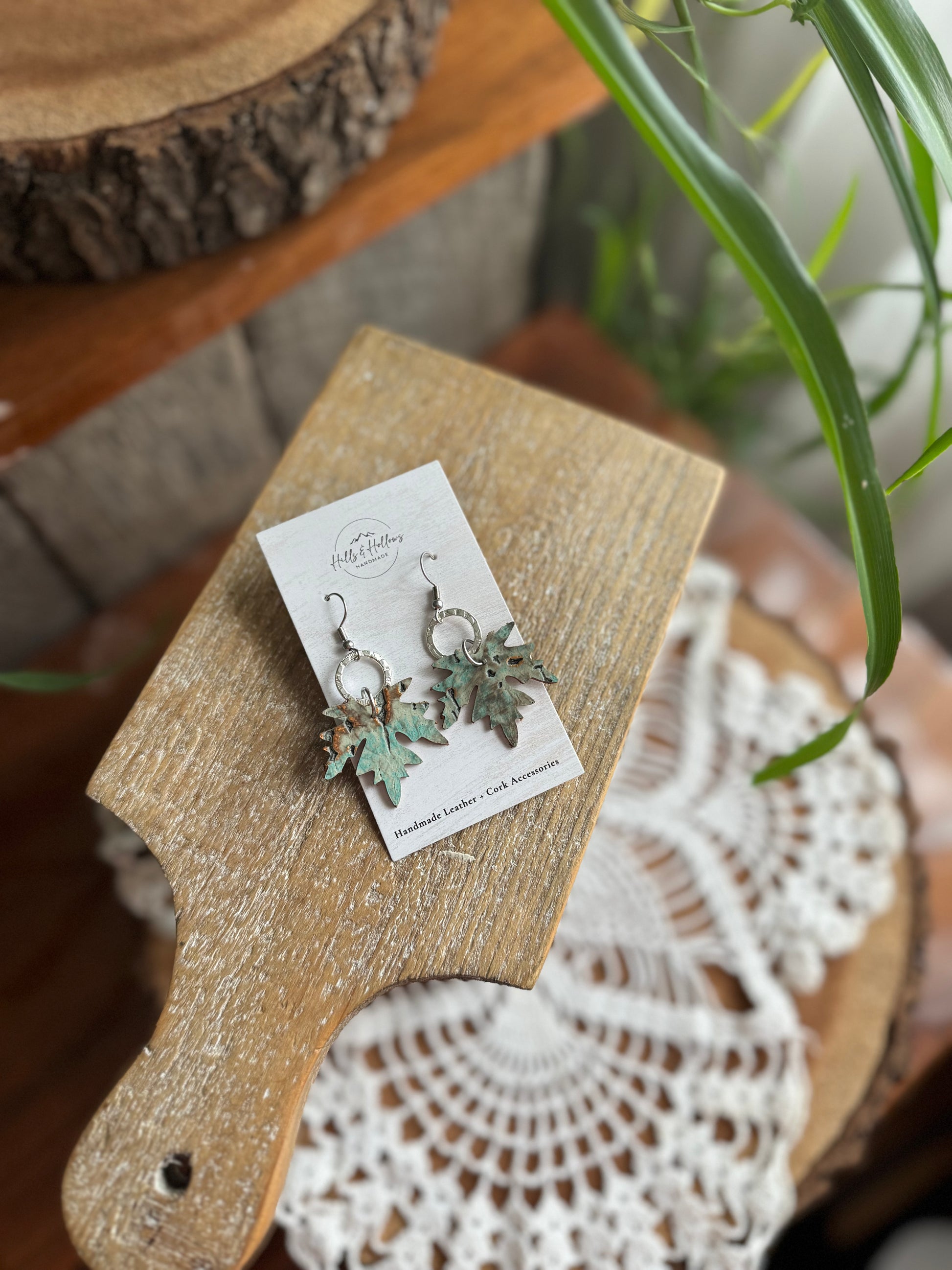 Gorgeous turquoise embossed leather with gold accents in the adorable maple leaf dangle
